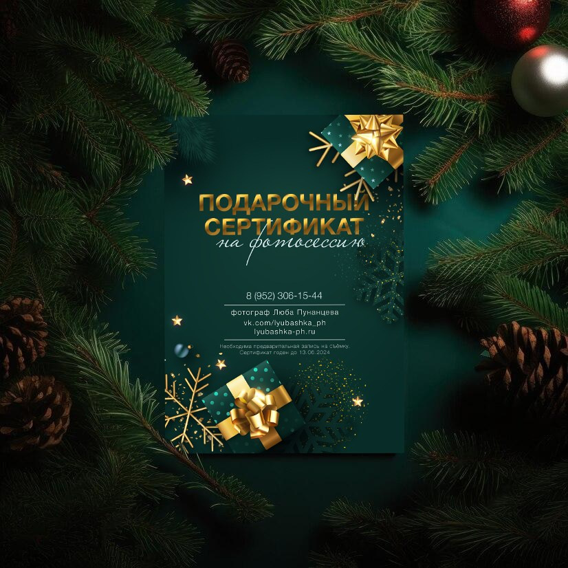 Сделайте этот Новый год незабываемым с подарком, который позволит сиять, улыбаться и чувствовать себя настоящей звездой. Приобретите подарочный сертификат на новогоднюю фотосессию!